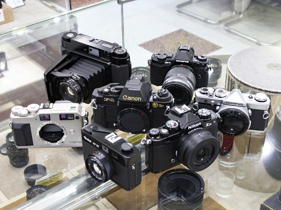 (左から)コンタックス G1 ROM改造、フジフイルム GF670 プロフェッショナル、ローライ XF35、キヤノン NewF-1 AE ロサンゼルスオリンピック1984、ニコン Zfc 16-50VR レンズキット、オリンパス OM-D E-M5 MarkⅡ + MZD14-150mm f4-5.6Ⅱ、オリンパス OM-1 MD シルバー
